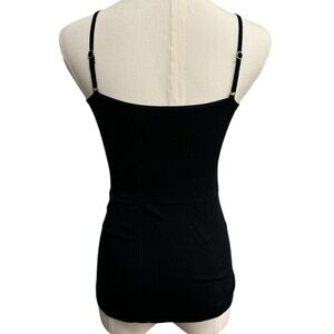 sleek and super stretchy, ribbed knit fabric, cami tank top featuring a deep V plunging neckline, with a sexy mesh sheer v piece insert. Adjustable spaghetti straps. Fitted bodice