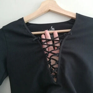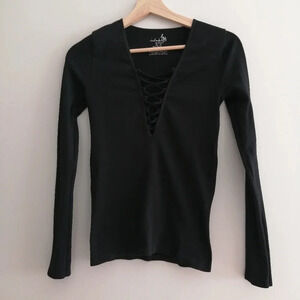 Free People Intimately Free Black Ribbed Lace Up Neck Long Sleeve Top M/L