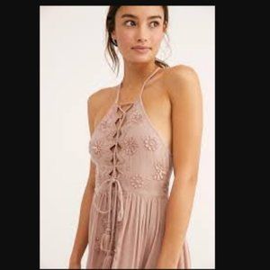 This beautiful flowy gauzy slip dress is a dusty mauve color. Dress has delicate sequin floral embroidery detail throughout. The lace up front shows a peekaboo detail across the chest, and ties with tassels. Adjustable thin straps and stretch smocking at back.