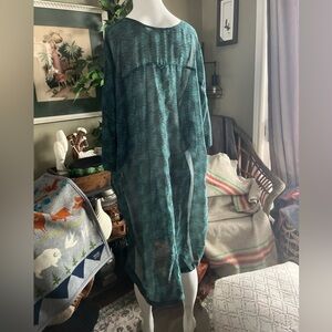 Flowy button-front shirt dress with a subtle wave print. Lightweight fabric with short dolman sleeves. Teal and dark teal colorway. Easy, breezy styling piece.