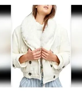 Soft cream jacket with a plush faux-shearling collar. Button-front design for easy wear and a cropped, stylish silhouette. Lightweight insulation keeps you warm while maintaining a fashionable look. Perfect for layering over sweaters and casual outfits.
