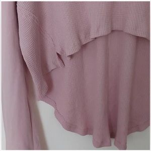 In a lovely pink this slouchy, cropped, high-low silhouette has long exaggerated sleeves with a contrasting fabric