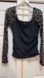 Features: Soft fabrication at the bodice, contrast lace sleeves with floral detailing, wide scoop-neckline with ruffled trim