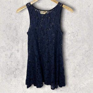 Free People Lace Dress in Navy Blue Women's Size XS. Sleeveless. Boat neck. 70% cotton and 30% nylon. Machine washable. Very good pre-loved condition but please note that this originally had a slip underneath (which is not included). Still makes a great beach coverup as is but if you want to wear on its own, a slip is needed.