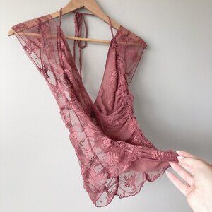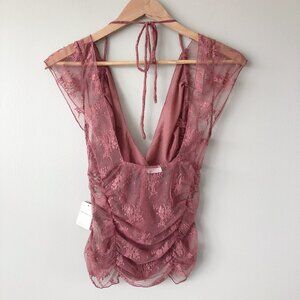 Features: Lace fabrication with floral detail, plunging neckline with wrap detail at bust, cap-inspired sleeves, low open back, adjustable tie at back of neck