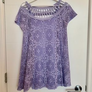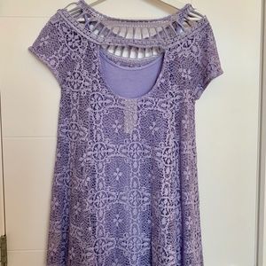 This short sleeve, above-the-knee lace dress has a matching detachable tank top slip underneath, and is made of cotton and nylon. Condition is good, size small.