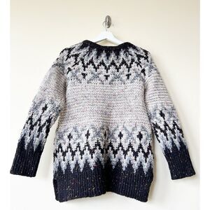 This Free People sweater is a women's pullover, featuring a multicolor Fair Isle pattern. Made from a wool blend, it has a round neckline and includes a front kangaroo pocket and lace-up detail. The sweater is designed for the fall season with a regular fit and a Nordic theme.