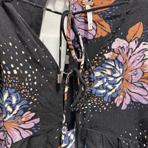 The Free People Lovely Day Black Floral Print Dress will make your day! Breezy woven fabric, features a pretty purple, rust, blue, and white floral print as it falls into a deep V-neckline, with two sets of ties, and a wide-cut, swing silhouette. Back cutout accented with gunmetal ring.