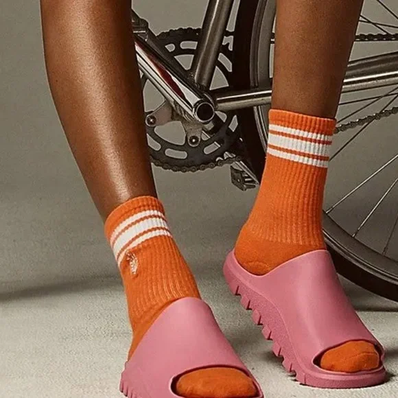 A pre and post workout essential, these sporty slides are featured in a smooth fabrication and slip on style with a dreamy, cushioned insole, a single wide strap, and bold traction details perfect for taking you from the studio to the street.