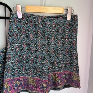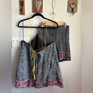 Free People Stylish Top/Short Set with intricate multicolor design. Features delicate straps and a vibrant pattern.