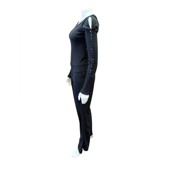 Black long sleeve ribbed texture braided sleeve key hole shoulder extra long sleeve cuff raw hem designs on sleeves and back wide round neck lots of stretch available