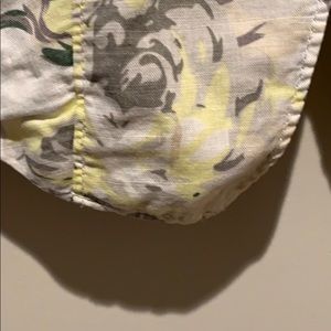 Two small coffee stains, as pictured: one on front, and one on elbow. Truly unnoticeable, as the pattern is busy.