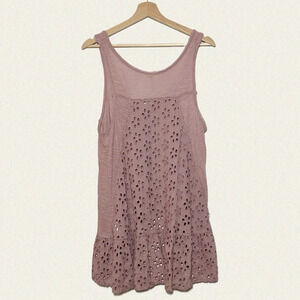 Oversized boho tank by Free People in a beautiful dusty pinkish-purple colour. High-low style hemline with super cute floral eyelet design on back. Functional lace-up front. This piece could also fit a small or medium due to the oversized and flowy style.