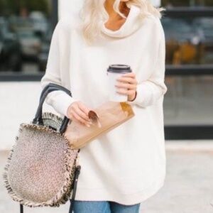 The popular Ottoman Tunic from Free People. Heavy knit ribbed tunic sweater in colour Ecru (white) featured in a slouchy, oversized fit. It’s made with a stretchy fabric and a sleek mock neck. Hand Wash Cold or Dry Clean.