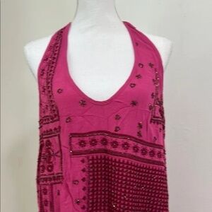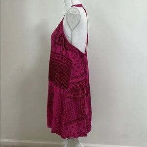 This stunning pink sundress by Free People is designed for casual and resort wear, featuring a chic halter neckline and a sleeveless, backless style. The dress boasts a relaxed fit with a soft, flowing fabric that enhances its elegant geometric patterns. Perfect for a sunny day, it combines comfort and style effortlessly.