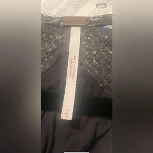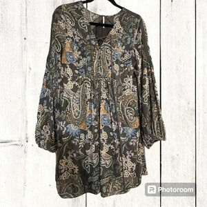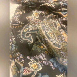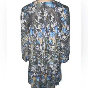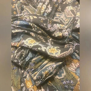 Dark gray with darks blues and gold paisley floral print. Long belled sleeves with elastic around wrists. . V neck with lace up. Fully lined. High low hem. Front pockets.