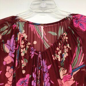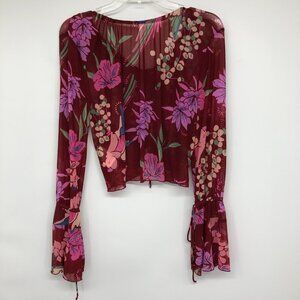 Free People Red Floral Piece Of Paradise Blouse Bell Sleeve Tie Front Crop Top S