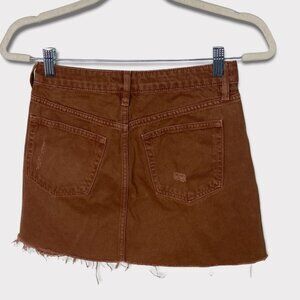 Free People We The Free Brown Bronze Denim A-Line Mini Skirt in Women’s Size 26 (or Small). Style OB826315. Distressing and a raw hem add cool-girl appeal to this sweet button-front skirt you can wear all year long.100% cotton. Machine washable. Very good pre-loved condition. No visible flaws.