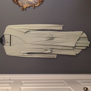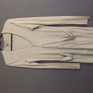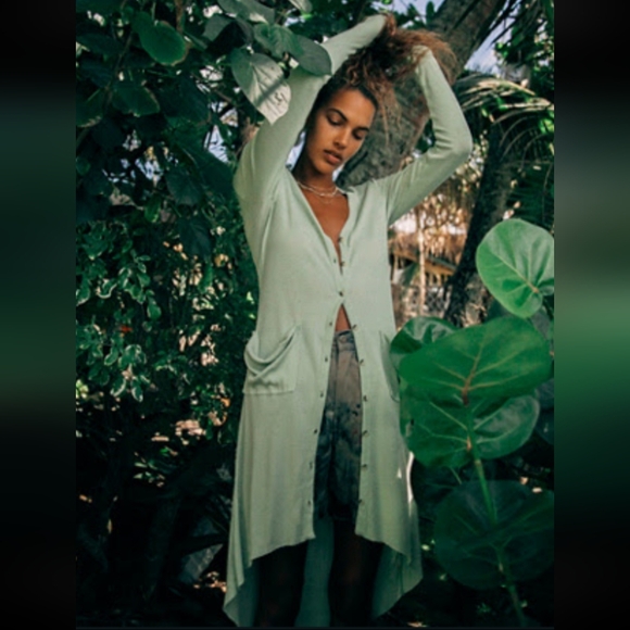 Popular and no longer available - Free People Ribbed Up long line cardigan in light green with front buttons and pockets. Perfect for layering.