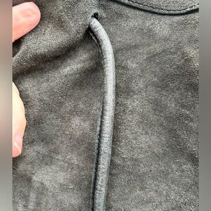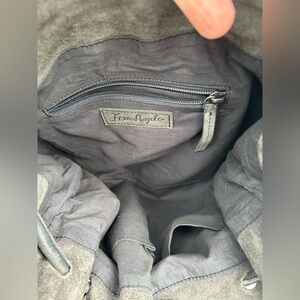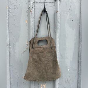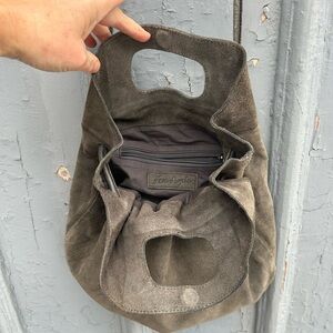 Luxe suede shoulder bag from FP Collection, featuring a top handle and long leather strap. Top magnetic closure, Lined interior, Inside zip and slip pockets.