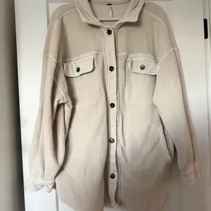 Soft and warm oversized shirt jacket. Features button closure, chest pockets and elbow patches.