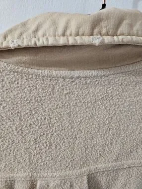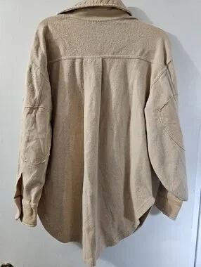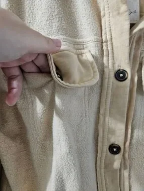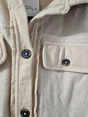 Soft teddy fleece jacket with a relaxed, shacket silhouette. Button-front closure with flap chest pockets and intentional distressing throughout. Side welt pockets for hands. Lightweight warmth for layering.