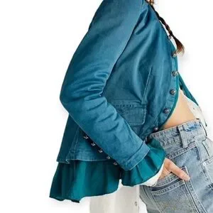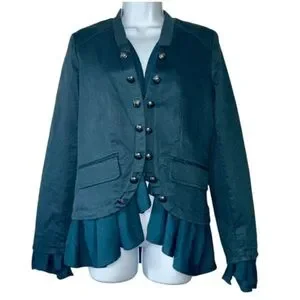 Chic dark teal blazer with ruffled edges. Features button accents and flowy fit. Worn just a few times, in great condition.
