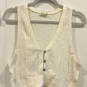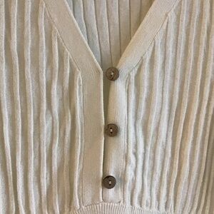 Form fitting ribbed tank. Size L. Pit 2 pit is 16” but stretches to 20”. Cropped silhouette. Creamy white color. Button up plunging neckline. Cute wooden buttons. Cotton and viscose. In excellent shape. Great for vacation.