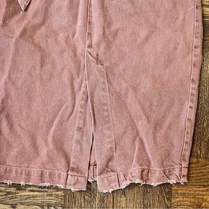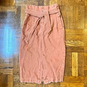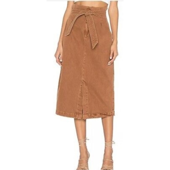 Brown denim paper bag skirt with distressed edges. Slit in center front, belt is sewn into side seams. Fits like an XS. Labelled as a 25 denim size.