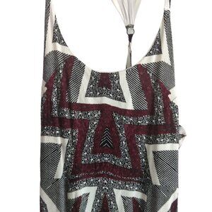 This is a sleeveless crepe maxi dress in an allover black, white and burgundy geometric print by Free People.