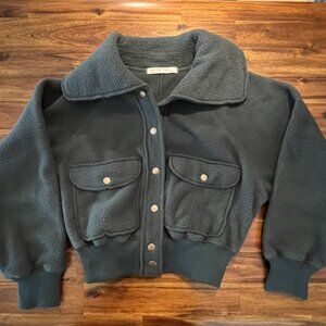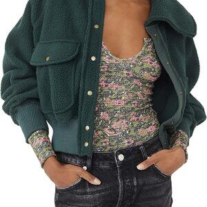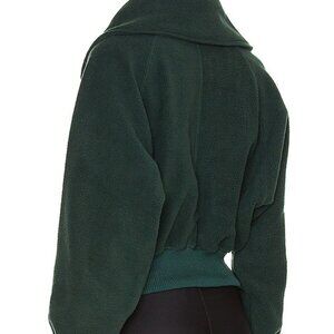 Fleece bomber-style jacket. Relaxed fit, slightly cropped silhouette. Deepest Spruce color. 100% polyester fleece.