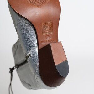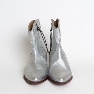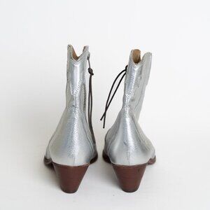 Stylish silver ankle boots with side zipper. Low brown heel for comfort.