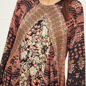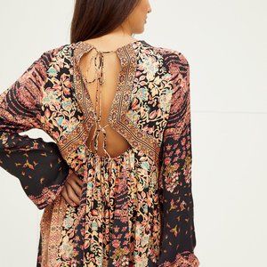 So pretty and printed, this flowy tunic is featured in a long sleeve silhouette with pleating at bottom and back tie closure for added dimension.