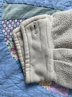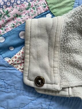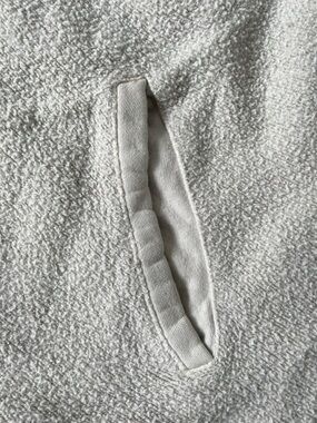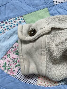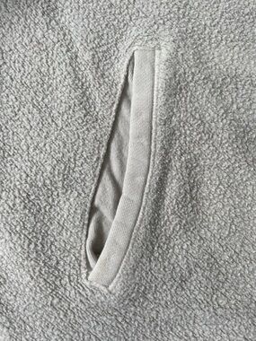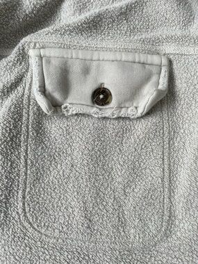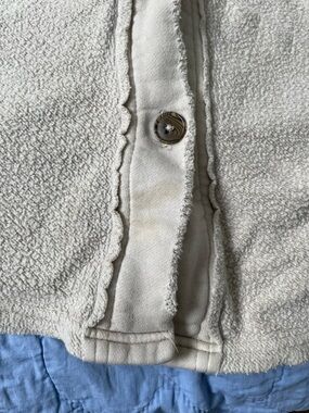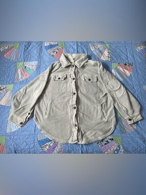 Cozy shacket in a neutral beige tone. Button-front with chest and hand pockets. Soft, relaxed fit for layering. Versatile casual piece. Oversized. Some staining from wear.