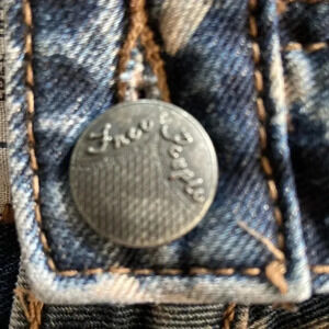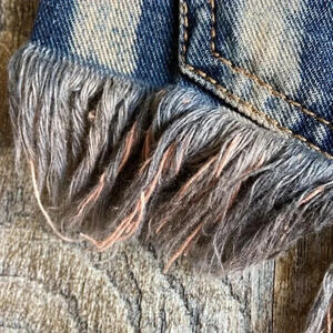 * blue / beige stripe with soft pink thread detail in fray and on distressed parts