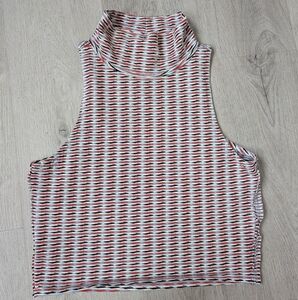 Elevate your style with this chic striped sleeveless turtleneck top. Featuring a vibrant red, black, and white pattern, this top is perfect for any occasion. Pair it with your favorite jeans or skirt for a trendy look.