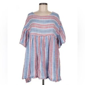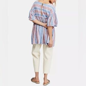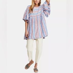 Embrace a relaxed style with this Free People tunic dress, featuring a bib collar and puff sleeves in a delightful blue and pink palette. The oversized, boxy silhouette offers a comfortable fit, perfect for a casual day out. Its lightweight fabric and tunic length make it an ideal choice for a breezy, effortless look.
