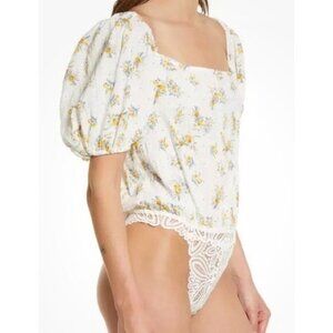 Free People Sz XS Bodysuit Angela Puff Sleeve White Floral boho Retro Coquette