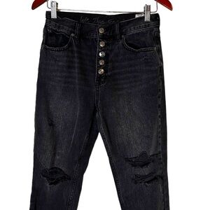 Distressed high rise jeans featured in a bootcut silhouette.
