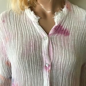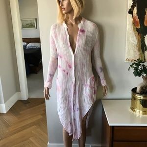 CFree People midi dress with a tie-dye pattern. Features button-up front and long sleeves. Perfect for casual outings. Perfect as a beach or pool cover up.