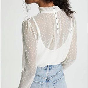 Brand new, in packaging, tags attached. Simple V-neck bodysuit featuring a billowy dotted mesh overlay with long sleeves and a mock neck. Size small.