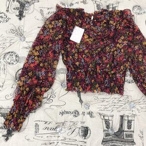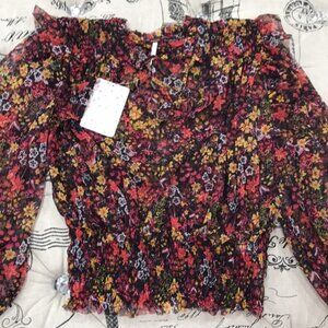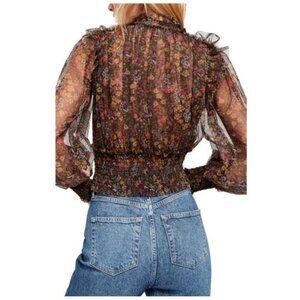 Full of romantic charm, this semi-sheer printed blouse is trimmed with fanciful frills and shapely smocking.