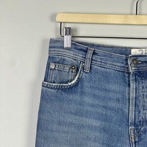 Free People We the Free Maggie Mid Rise Straight Jeans Bondi Blue. Button close. 5 pocket design. Chewed hem. Cropped length. Small bit of distressing on edges of front pockets. No other distressing. Materials: 100% Cotton. No real stretch. No known flaws.