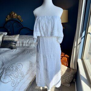 Free People white prairie dress, lace eyelet design, off the shoulder with optional straps. Zips up back. 100% cotton dress, 65% rayon 35% cotton lining. Size small, new with tags. Has one tiny mark on back right shoulder as shown in 5th photo. Bust measures 16 inches laying flat but has a bit of stretch, waist is 14 inches, hips 19 inches, dress length is about 44.5 inches from the shoulder straps to hem. Cat friendly, nonsmoking home.
