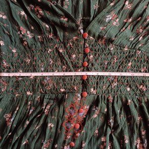 Size small, but would also fit medium due to the style - it's loose on me. Great condition, no flaws. Gorgeous forest green colour with wildflower embroidery. V-neckline + smocked waistband. Wish I could pull it off!