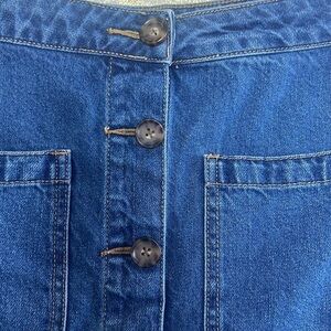 Button closures down front,Front patch pockets,Back welt pockets,Rigid denim,100% cotton
