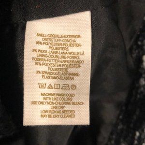 Features: Button up in front, collar, peacoat style, wool, black buttons, long sleves, pockets in front, slit in back, silk-like liner, Merle style fabric