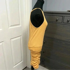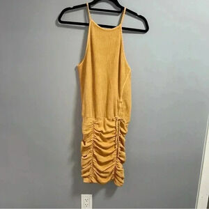 Chic yellow dress with ruched detailing. Sleeveless design. Perfect for casual outings.