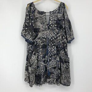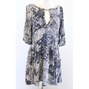 Free People blue printed Love Birds mini dress / long tunic bohemian w/pockets