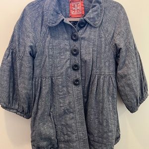 Free people chambray jacket. Size small. Beautiful cotton lining in interior. 5 large buttons down front. Artist/Bohemian aesthetic. Classic Free People oversized fit. Good condition-Sam written on interior tag. Approximately 17" across chest and 27.5" long.